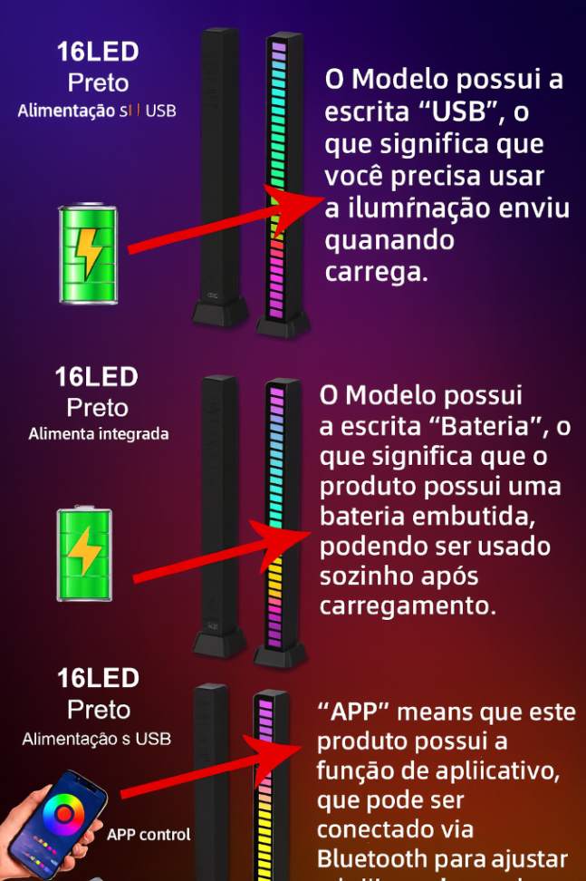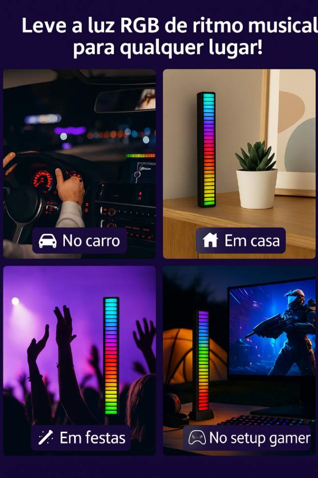 Com versões de 16, 32 e 40 LEDs, ela reage aos sons da música e às batidas do ambiente, criando efeitos luminosos dinâmicos e sincronizados que tornam cada momento inesquecível.