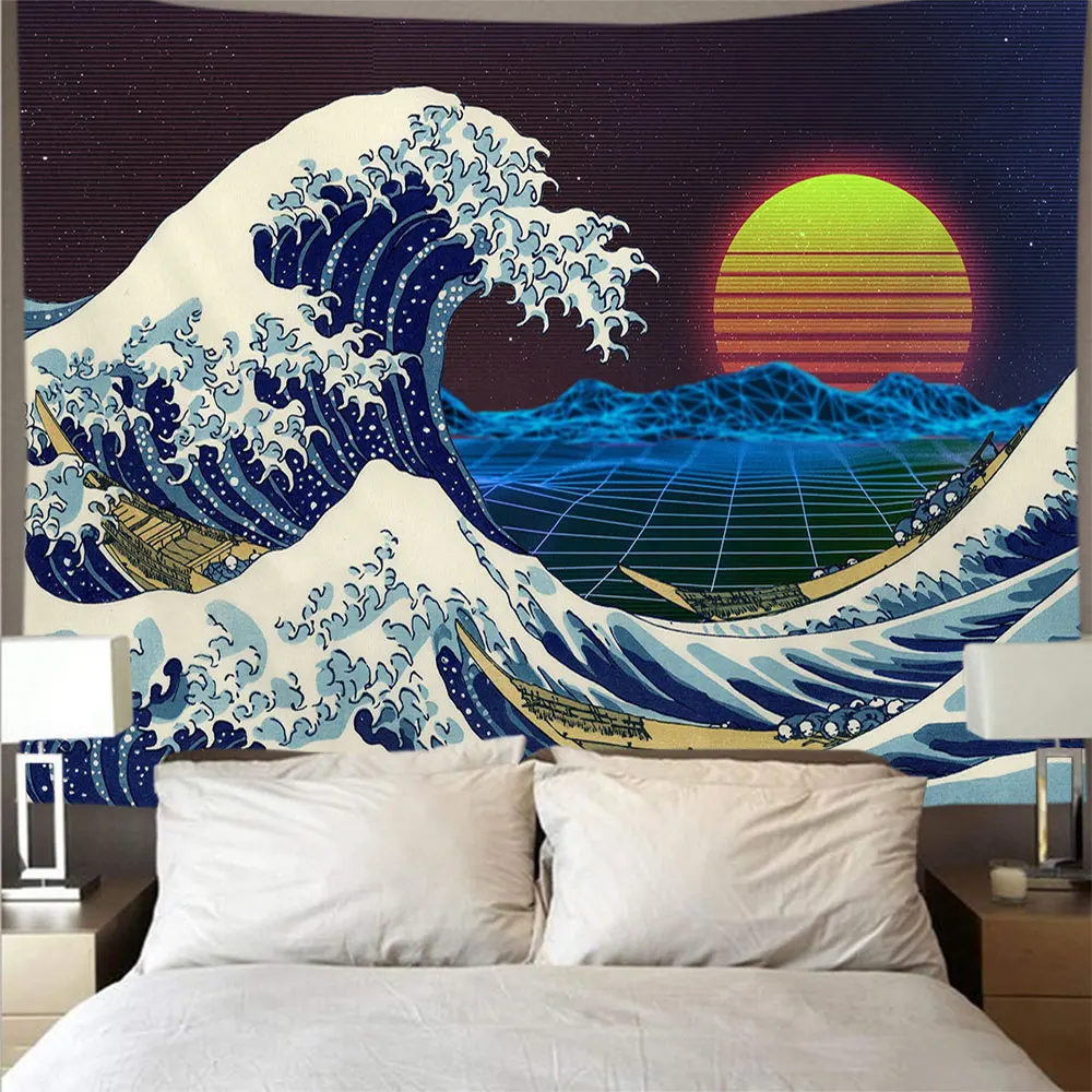 Estilo japonês samurai espada alegre japonês tigre tapeçaria pendurado grande a grande onda lua arte decoração de parede pano pano pano panoLista de embalagem: 1 * tapeçaria (inclui acessórios de decoração gratuitos)