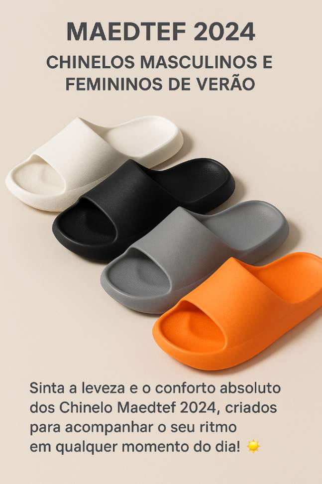 Desenvolvidos com materiais premium e tecnologia antiderrapante, os chinelos Maedtef garantem maciez e segurança a cada passo. Disponíveis em várias cores vibrantes e tamanhos para todos os pés, são a escolha ideal para o verão brasileiro! 🇧🇷